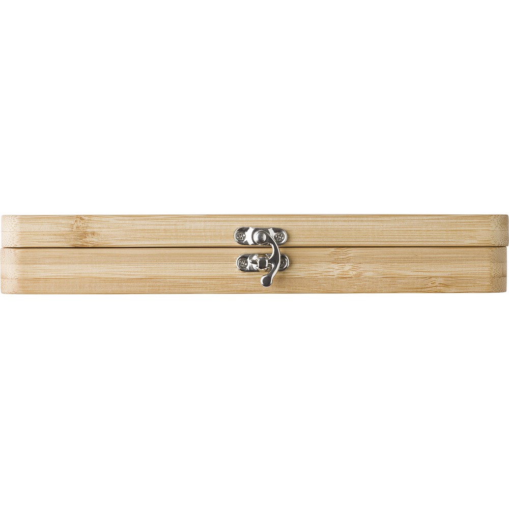 Zestaw narzędzi ze stali węglowej, 20 el., w zestawie: 3 śrubokręty, 10 bitów z uchwytami, adapter, 4 klucze nasadowe, nóż, uchwyt, złącze, w bambusowym pudełku zamykanym na klip