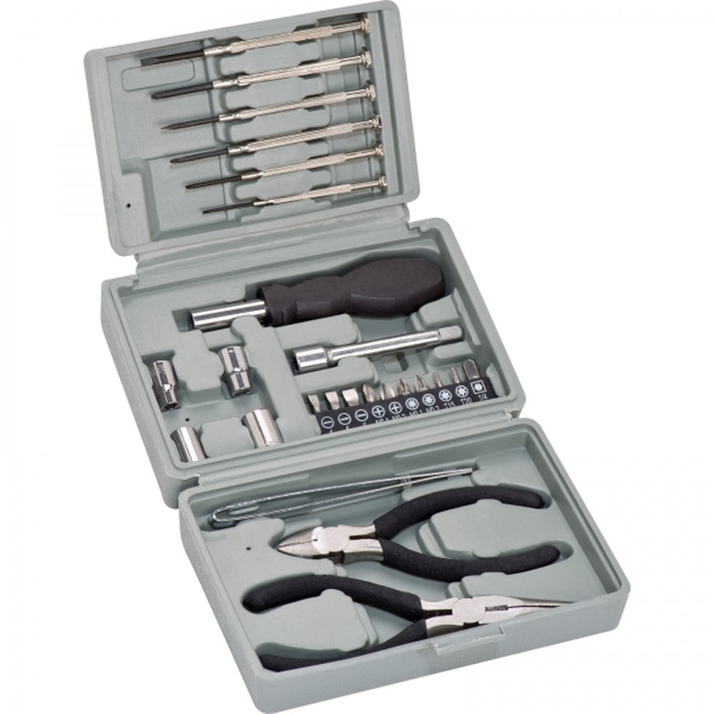 25-częściowy zestaw narzędzi ze stali umieszczony w plastikowym pudełku.