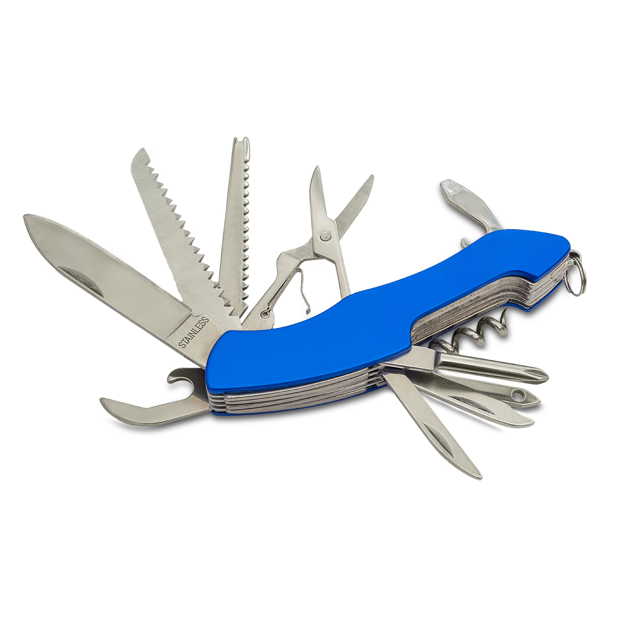 Zestaw składający z latarki z 9 diodami i noża wielofunkcyjnego składającego się z 11 elementów (nóż, piła, skrobak do ryb, nożyczki, otwieracz do butelek, otwieracz do puszek, dziurkacz, pilnik do paznokci, śrubokręt krzyżakowy, korkociąg, dłuto). Całość spakowana w kraftowe pudełko. Baterie w komplecie.