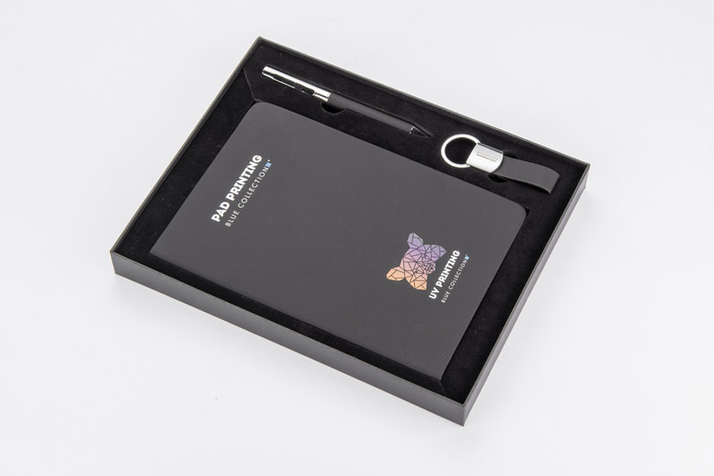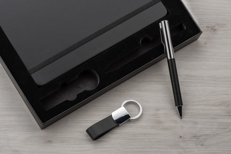 Zestaw PROBIZ składa się z notesu, długopisu i breloka. Notes posiada gładkie kartki wykonane z papieru kamiennego, format A5. Brelok wykonany jest z metalu i materiału skóropodobnego (PU). Długopis z niebieskim wkładem. Całość zapakowana w gustowne czarne pudełko. Zestaw prezentuje się niezwykle elegancko. Wymiary produktu: 145 x 210 x 13 mm (notes); 132 x ⌀ 10 mm (długopis); 62 x 20 x 9 mm (brelok); 210 x 260 x 30 mm (pudełko)