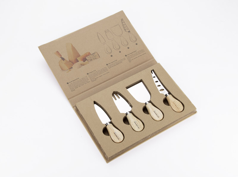 Zestaw 4 noży do sera zapakowany w klasyczne, porządnie wykonane papierowe pudełko. Wewnątrz opakowania umieszczona jest infografika wraz ze zdjęciem i opisem do czego dany nóż jest przeznaczony. Ten zestaw to doskonały pomysł na prezent. Noże wykonane ze stali nierdzewnej.