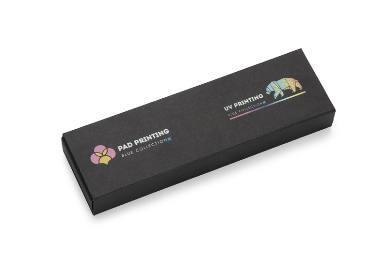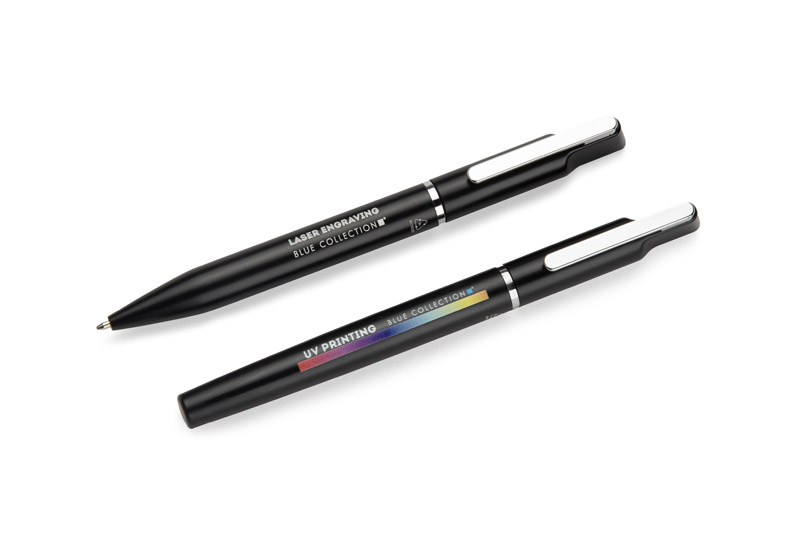 Zestaw piśmienniczy EFAN to stylowy komplet składający się z długopisu oraz pióra kulkowego, wykonanych z recyklingowanego aluminium. Oba elementy mają smukłą, czarną konstrukcję z matowym wykończeniem i subtelnymi srebrnymi detalami. Długopis wyposażony jest w niebieski wkład, a pióro kulkowe w czarny, oba o grubości pisania 1,0 mm i długości do 500 metrów. Całość zapakowana w czarne kraftowe pudełko papierowe.