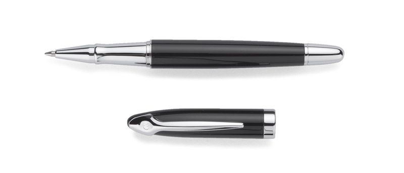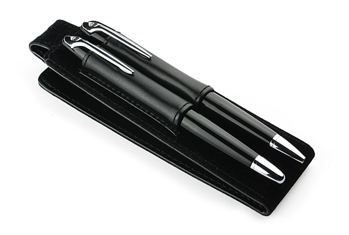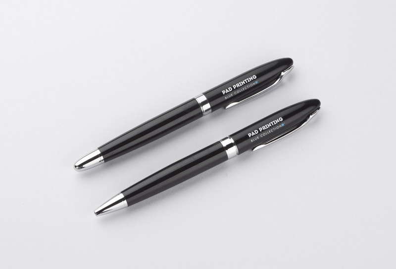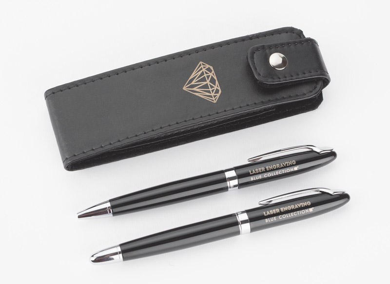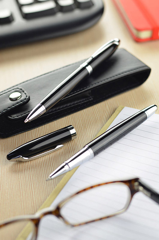Elegancki zestaw piśmienniczy składający się z długopisu i pióra kulkowego. Zapakowany jest w etui wykonane z materiału skóropodobnego (PU). Grawer logo możemy wykonać na artykułach piśmienniczych.