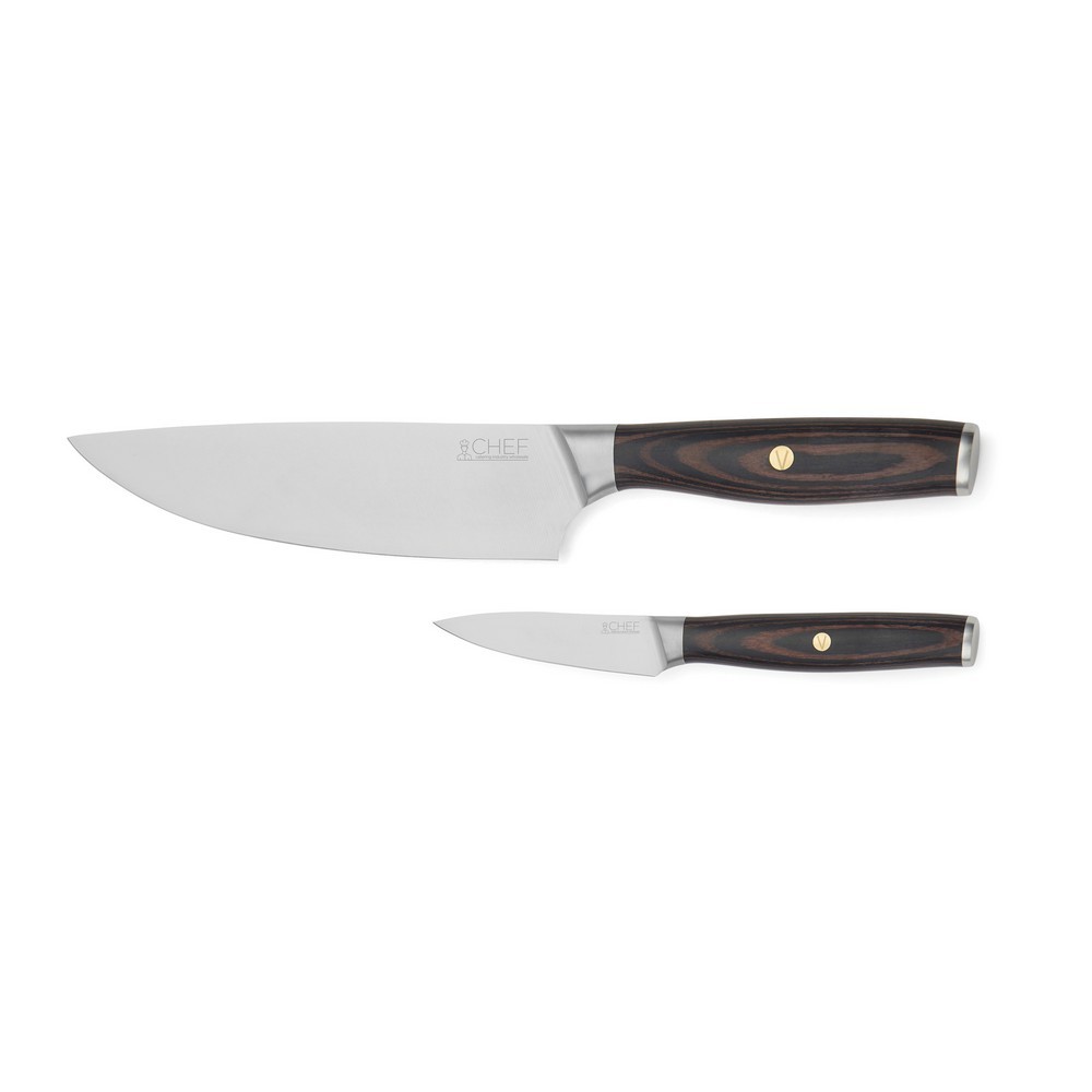 Zestaw noży kuchennych 2 szt., wykonane ze stali nierdzewnej pochodzącej z recyklingu z certyfikatem RCS, drewniane uchwyty, długość ostrza mniejszego noża: 8,5 cm, długość ostrza większego noża: 21 cm, całkowita zawartość materiałów z recyklingu obliczona w oparciu o wagę całkowitą przedmiotu: 23%, wyłącznie mycie ręczne