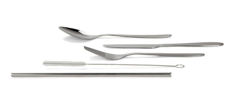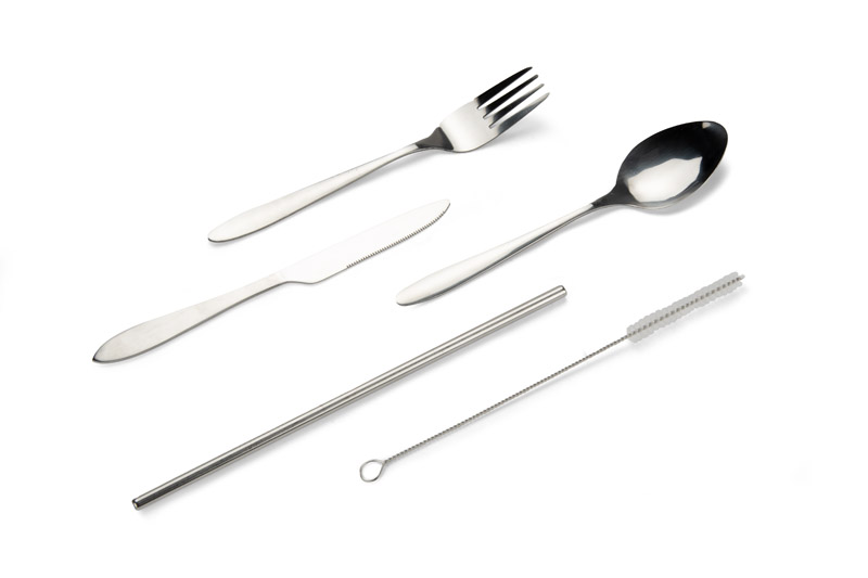Zestaw sztućców ZUNA to praktyczny komplet wykonany z metalu, idealny do użytku w podróży, pracy lub na lunch poza domem. W skład zestawu wchodzą nóż, widelec, łyżka, metalowa słomka oraz szczoteczka do jej czyszczenia. Całość zapakowana jest w miękki woreczek z neoprenu, który chroni zawartość i ułatwia przechowywanie. Funkcjonalny i estetyczny zestaw, który sprawdzi się jako praktyczny gadżet reklamowy.