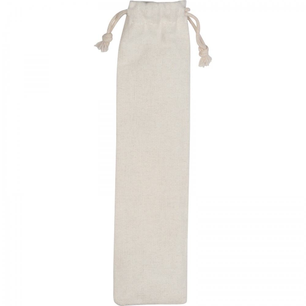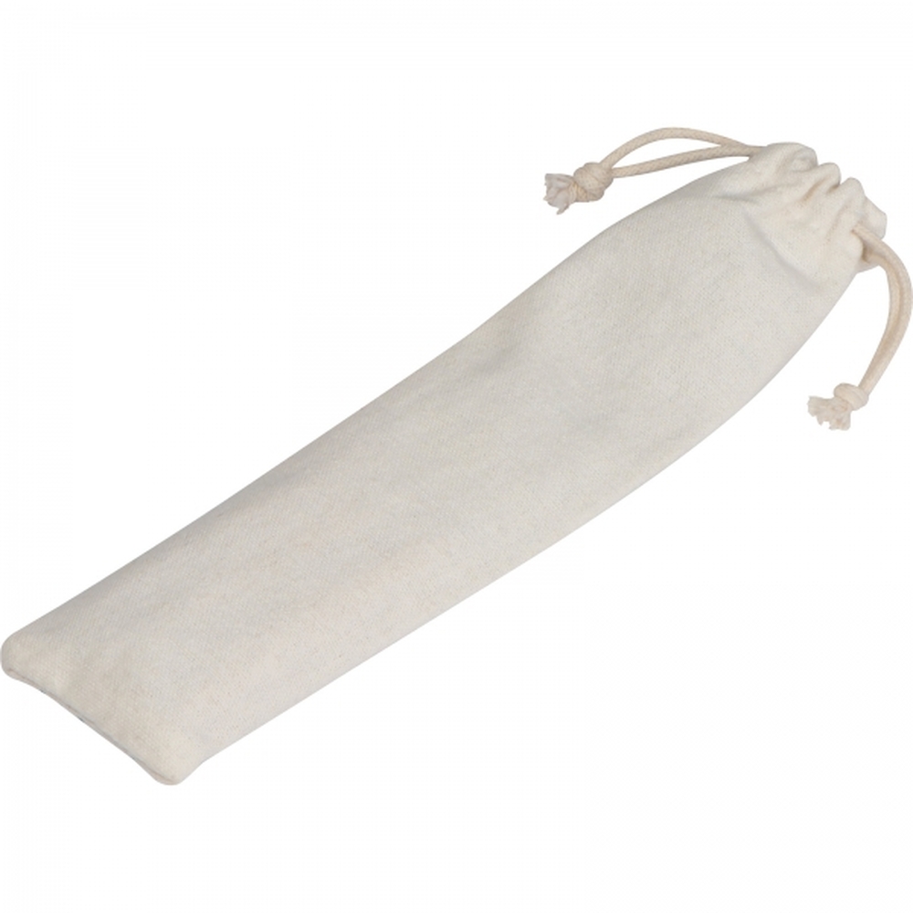 Zestaw sztućców wykonanych ze stali nierdzewnej i drewna, zapakowany w bawłniany woreczek. Zestaw zawiera łyżkę, widelec i nóż.