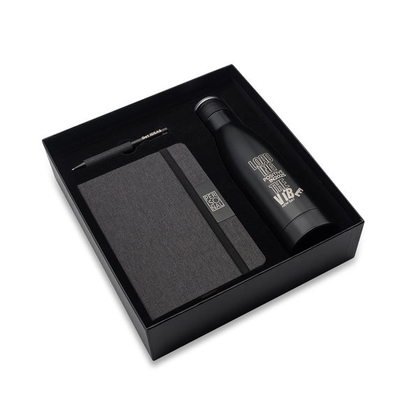 Biznesowy zestaw składający się z butelki próżniowej, notesu i długopisu. Całość zapakowana w eleganckie, czarne pudełko. Butelka próżniowa ze stali nierdzewnej o podwójnych ściankach (stal 18/8 wewnątrz, 18/0 na zewnątrz), ze składanym uchwytem. Utrzymuje temperaturę powyżej 40°C do 15 godzin. Pojemność 500 ml. Notatnik formatu A5, twarda okładka z tkaniny RPET, ozdobiona czarnym metalowym elementem; 80 kartek w kratkę, o gramaturze 70 g/m². Metalowy długopis ozdobiony tkaniną RPET. Niebieski wkład 1,0 mm.