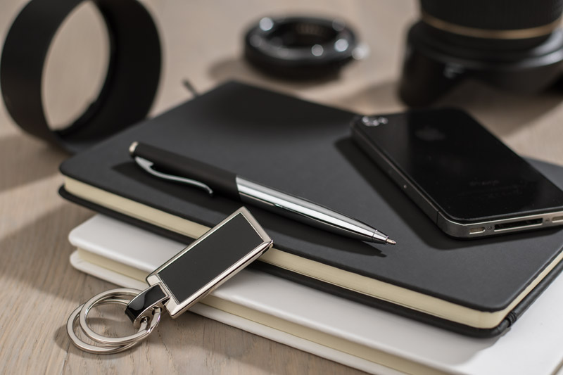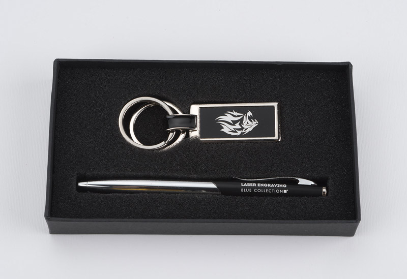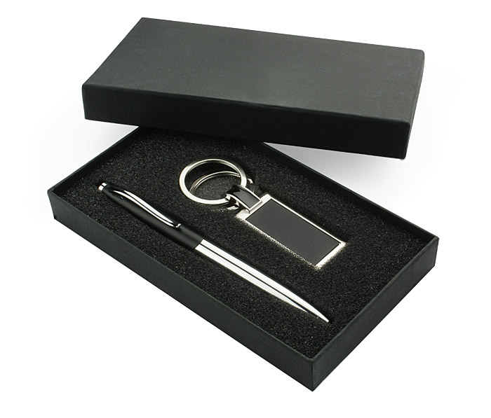 Zestaw upominkowy składający się z breloka i długopisu. Długopis z czarnym wkładem. Dodatkowo brelok posiada dwa kółeczka, które ułatwią podział kluczy. Grawer zrobimy na długopisie lub też nadrukujemy logo na pudełku.